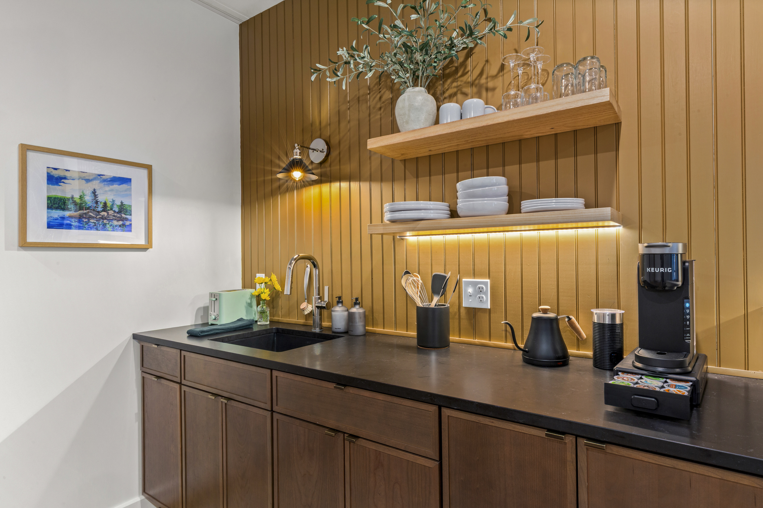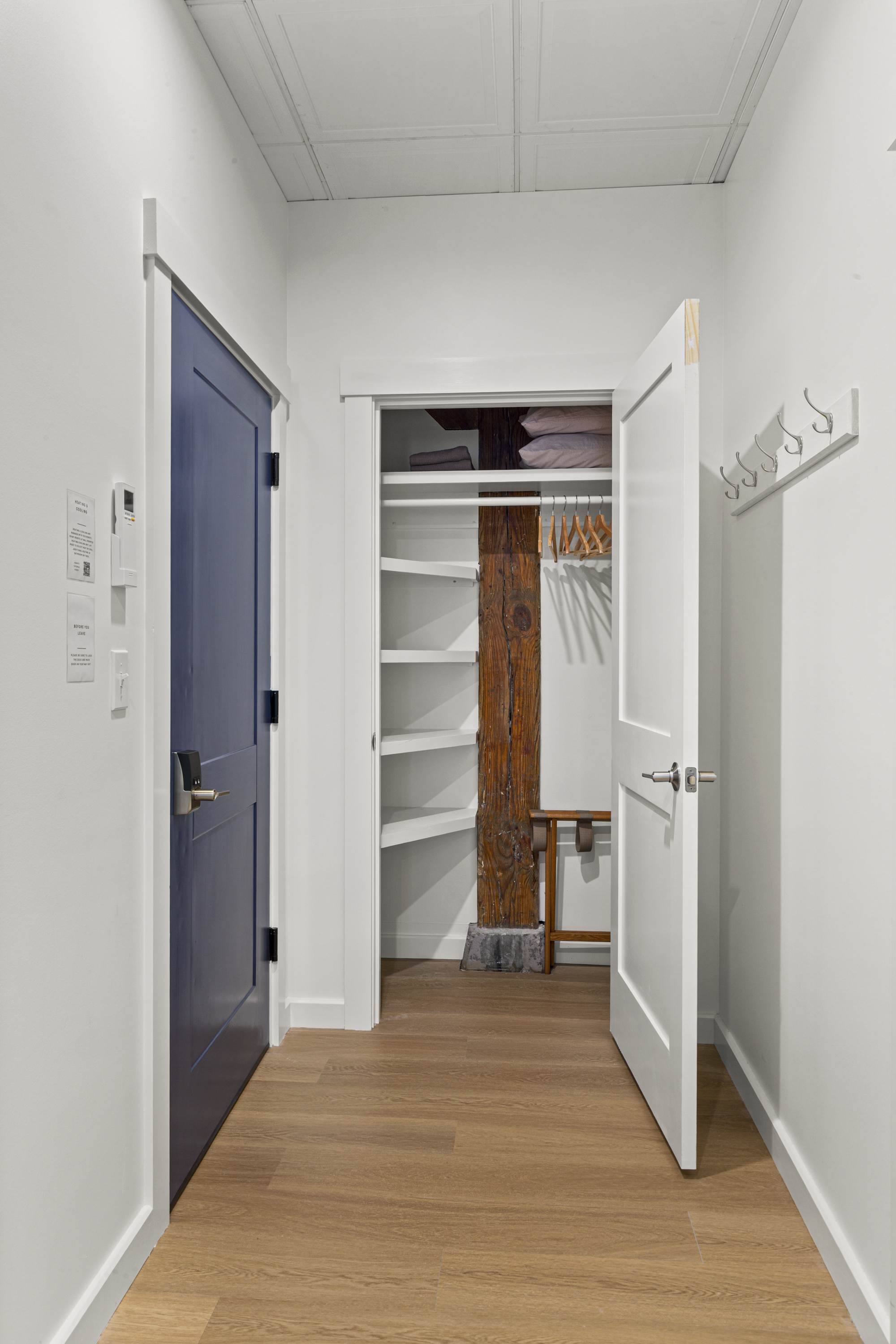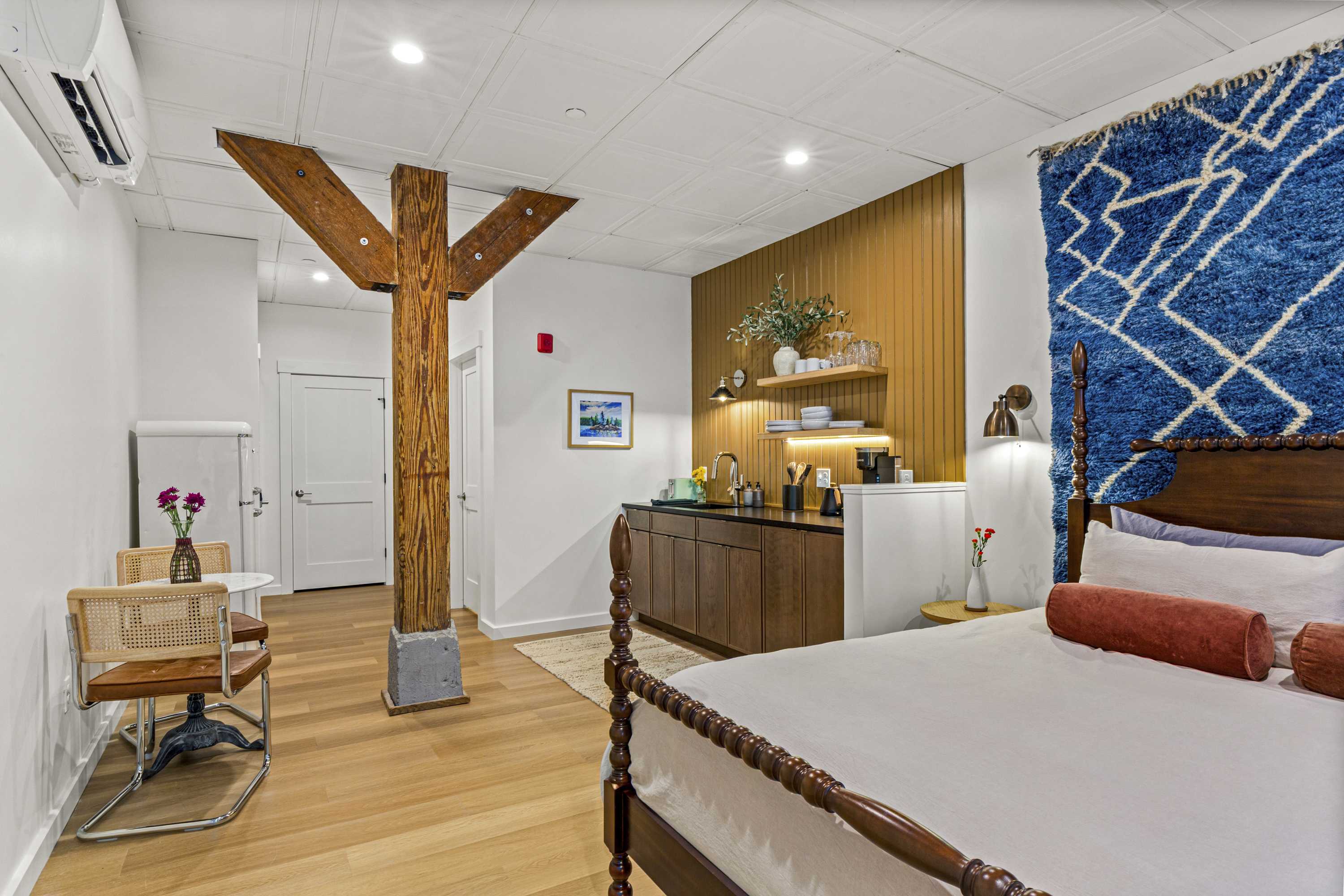 The Optimist Guesthouse is located in the Knox Mill, a historic woolen mill built in the mid 1800s along the Megunticook River in downtown Camden, Maine. Operational until 1988, the mill specialized in producing wool felt. The Optimist's balcony looks over the scenic Megunticook River as it flows into town. The Optimist Guesthouse consists of five apartments, a lobby area, and a small, shared gym room with infrared sauna. Down the hall you'll find our friends at 40 Paper Bistro & Bar, a delicious local eatery. Across the bridge you'll find The Jack bar and restaurant, and just up or down the street will bring you to more options. Being a retrofit of a historic building on a slab foundation, the plumbing is on a pump system, which you will hear when using water.