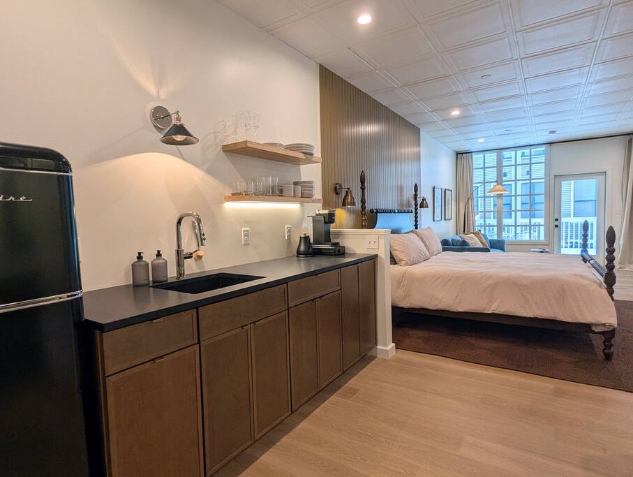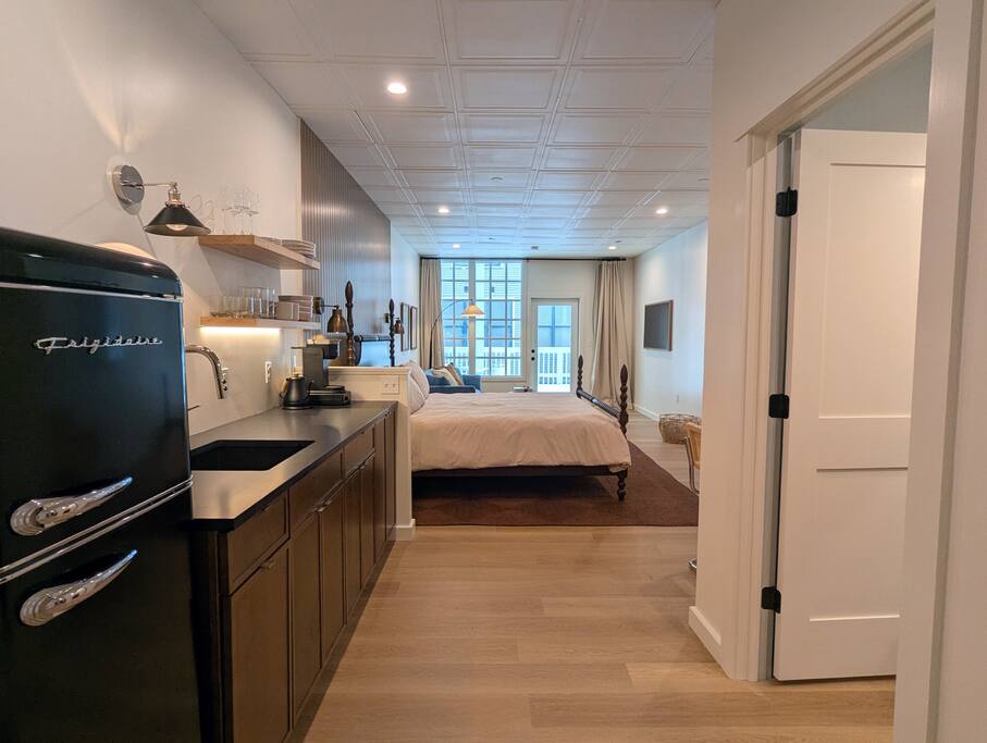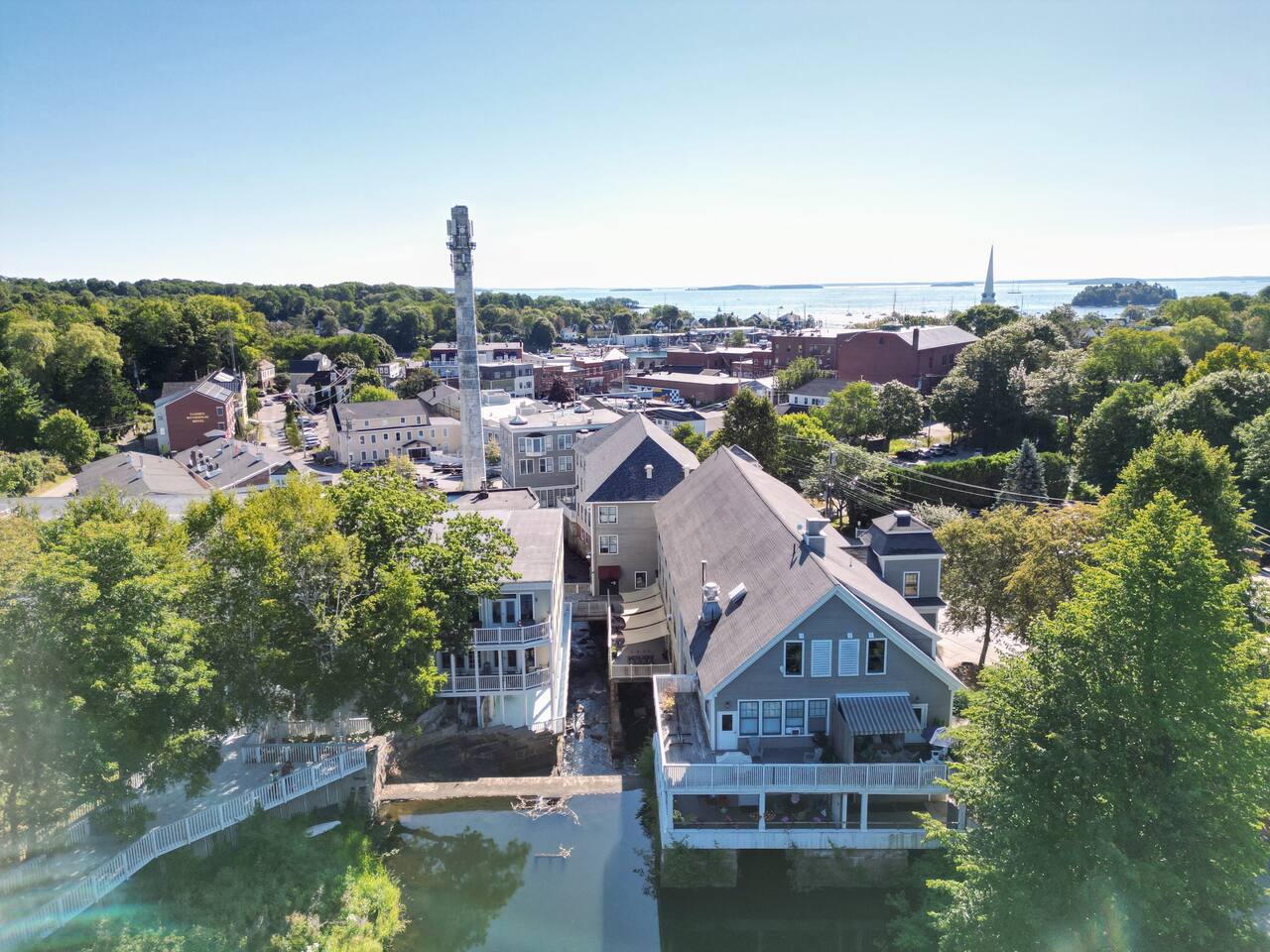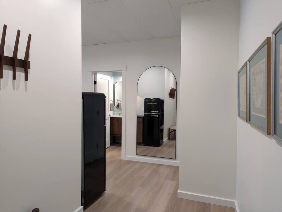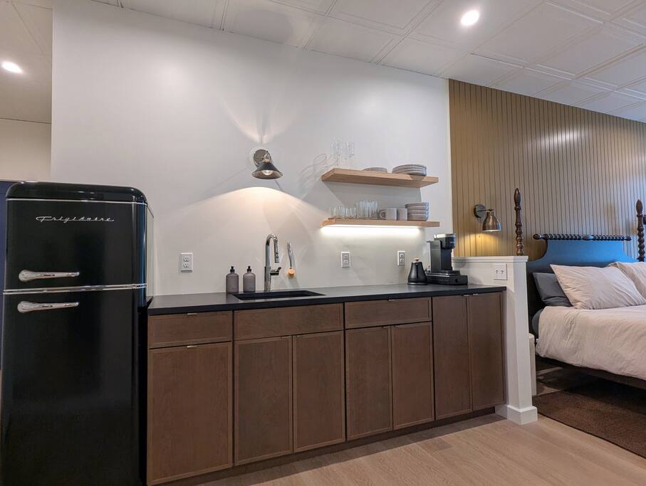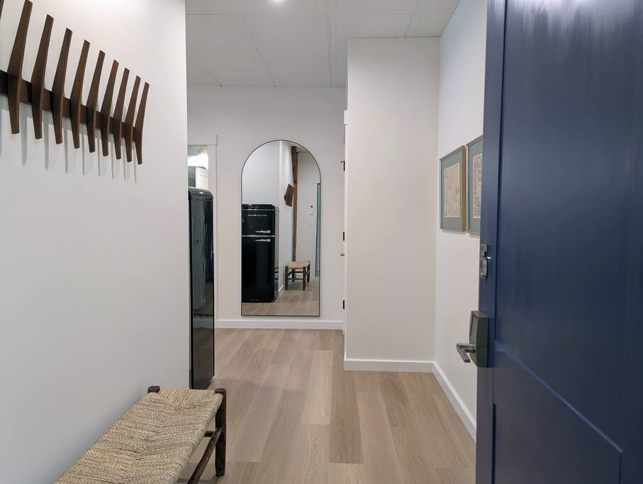 The Optimist Guesthouse is located in the Knox Mill, a historic woolen mill built in the mid 1800s along the Megunticook River in downtown Camden, Maine. Operational until 1988, the mill specialized in producing wool felt. The Optimist's balcony looks over the scenic Megunticook River as it flows into town. The Optimist Guesthouse consists of five apartments, a lobby area, and a small, shared gym room with infrared sauna. Down the hall you'll find our friends at 40 Paper Bistro & Bar, a delicious local eatery. Across the bridge you'll find The Jack bar and restaurant, and just up or down the street will bring you to more options. Being a retrofit of a historic building on a slab foundation, the plumbing is on a pump system, which you will hear when using water.