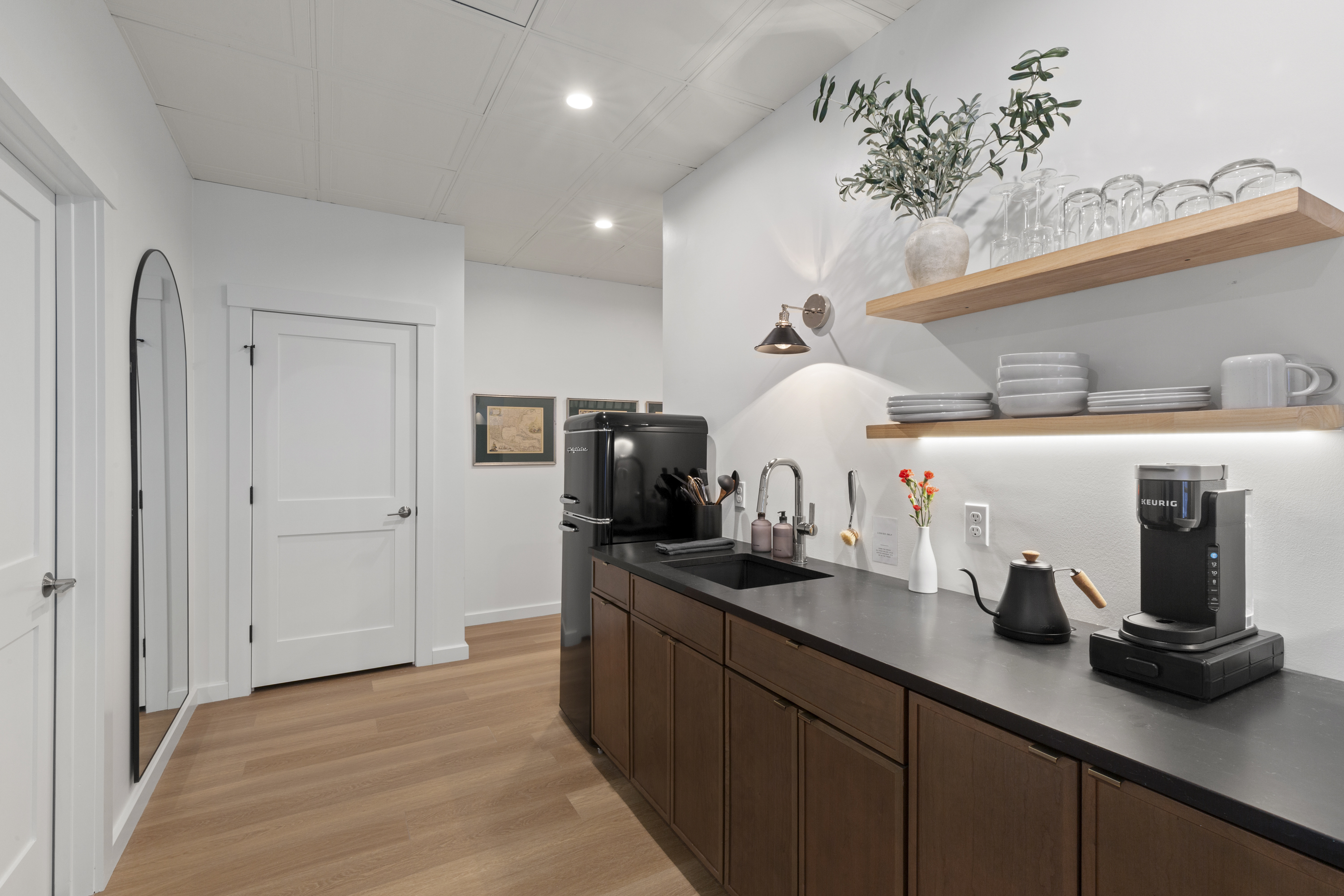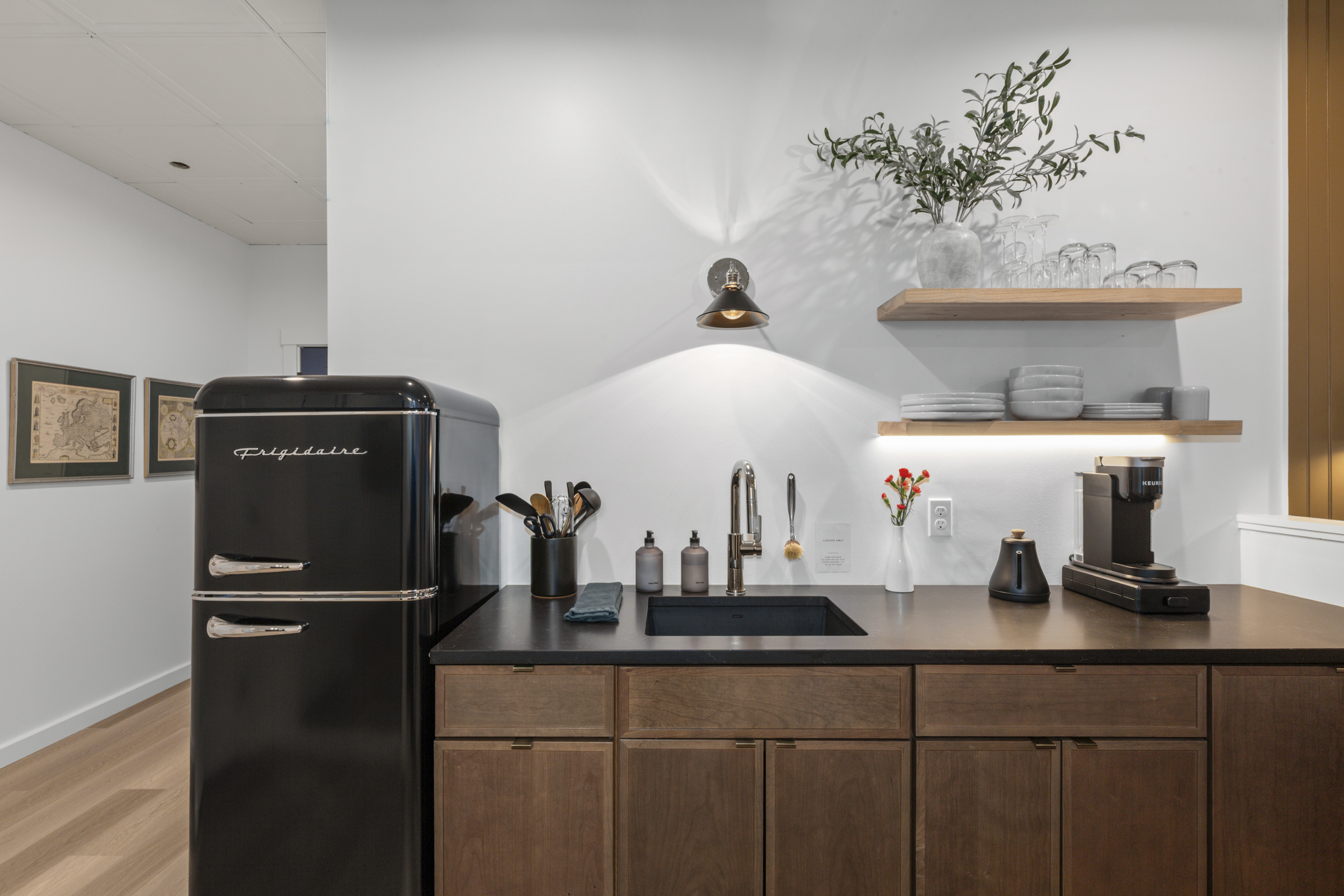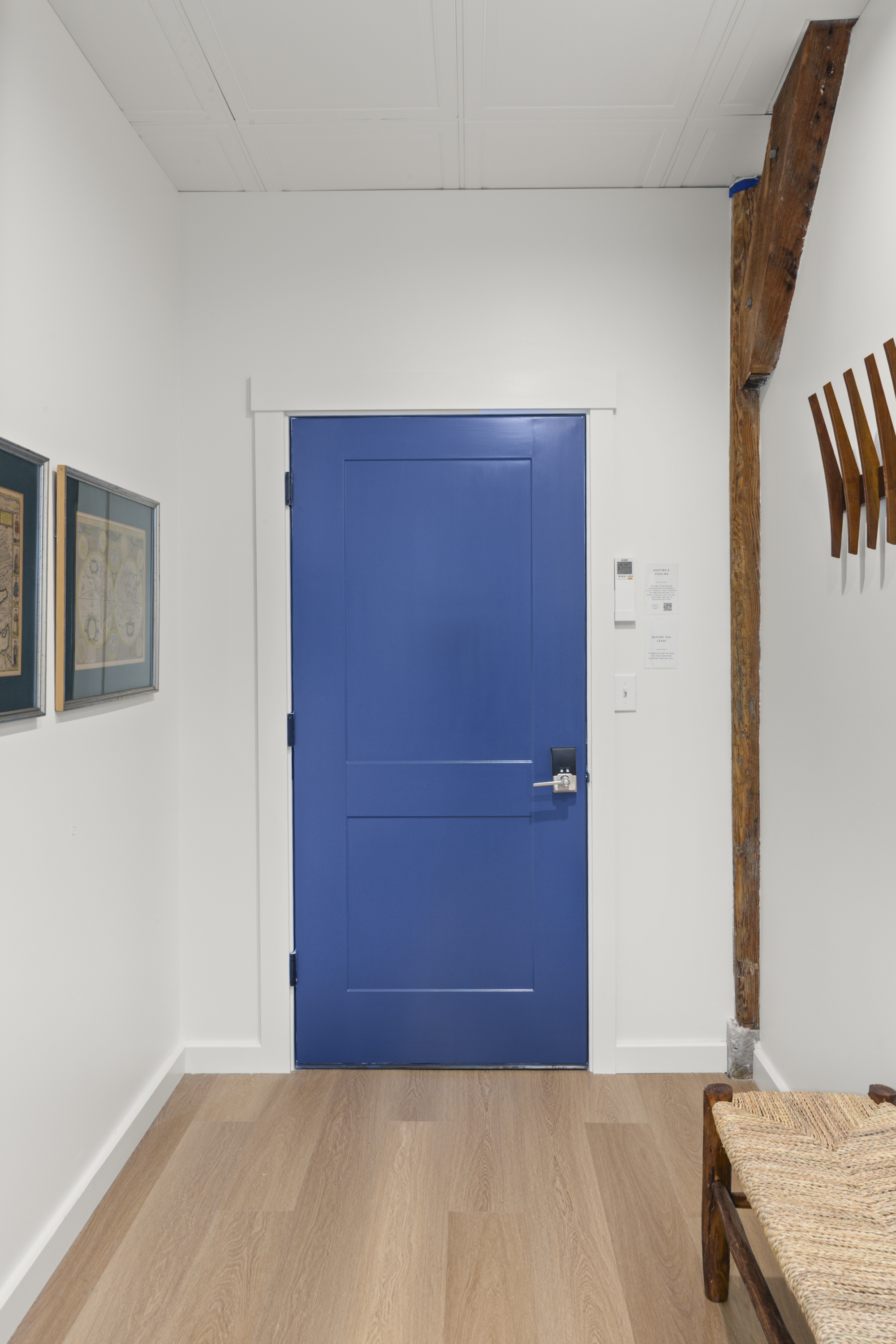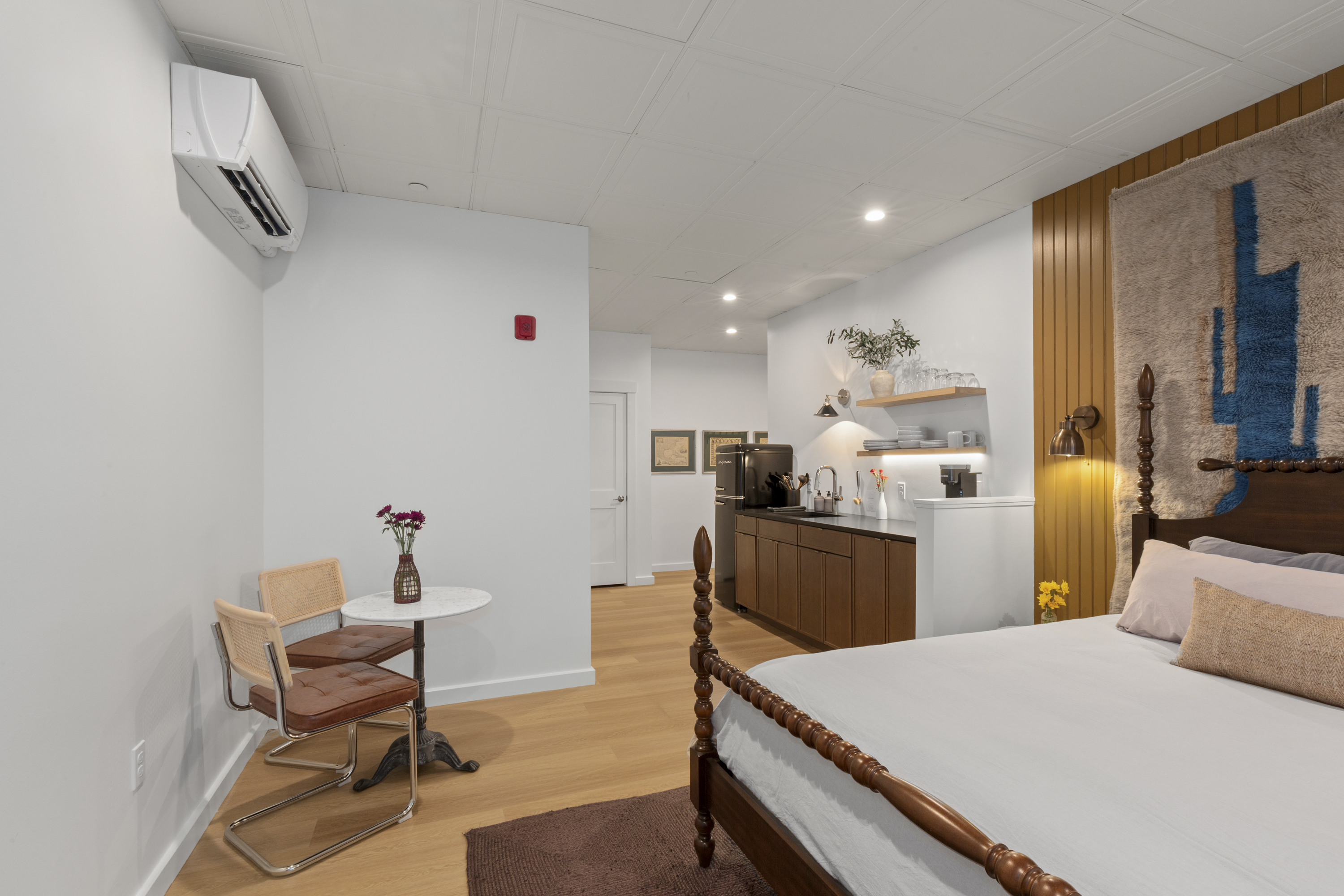 The Optimist Guesthouse is located in the Knox Mill, a historic woolen mill built in the mid 1800s along the Megunticook River in downtown Camden, Maine. Operational until 1988, the mill specialized in producing wool felt. The Optimist's balcony looks over the scenic Megunticook River as it flows into town. The Optimist Guesthouse consists of five apartments, a lobby area, and a small, shared gym room with infrared sauna. Down the hall you'll find our friends at 40 Paper Bistro & Bar, a delicious local eatery. Across the bridge you'll find The Jack bar and restaurant, and just up or down the street will bring you to more options. Being a retrofit of a historic building on a slab foundation, the plumbing is on a pump system, which you will hear when using water.