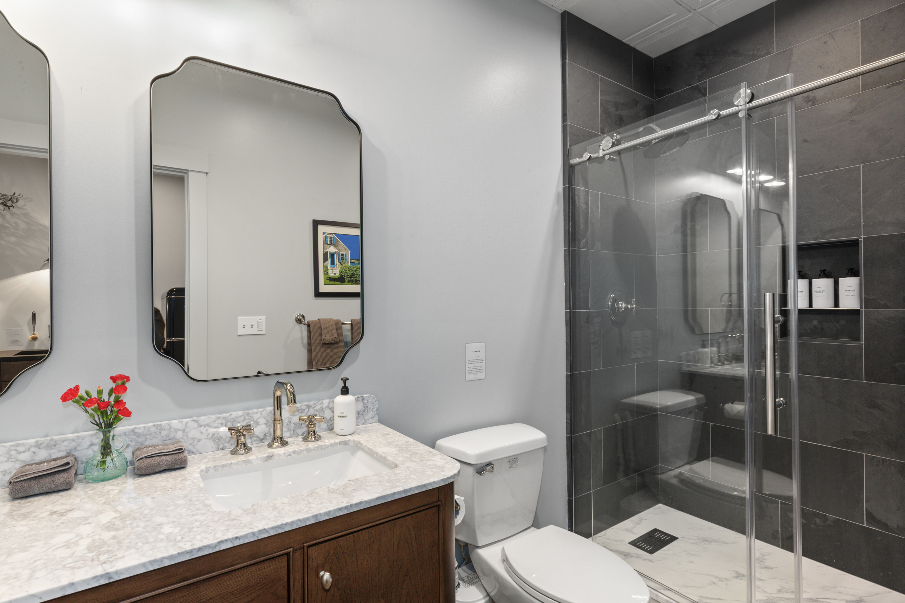 Being a retrofit of a historic building on a slab foundation, the plumbing is on a pump system, which you will hear when using water.